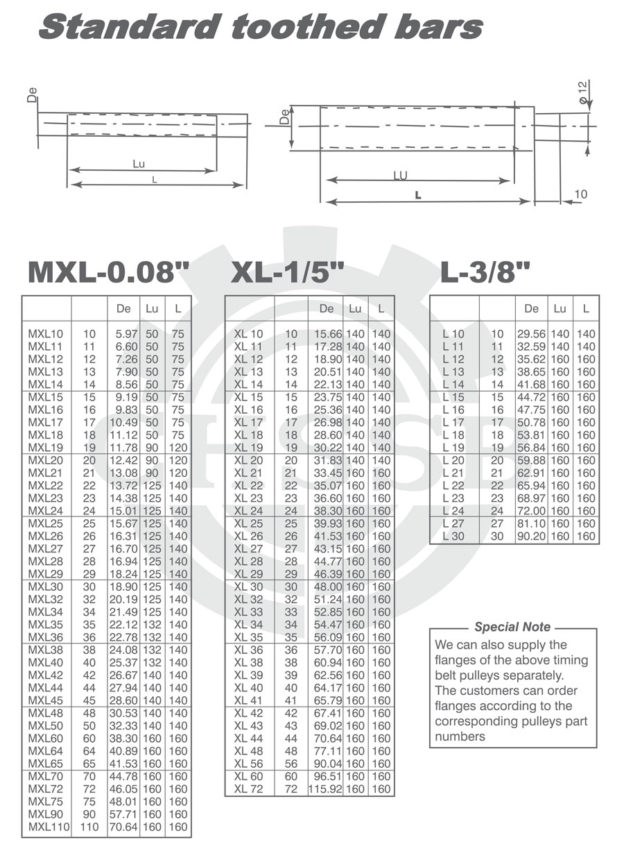 產品范圍: 美標/歐標:(MXL-0.08/XL-1/5/L-3/8) 英制尺寸產品(適用于美標市場) 公制尺寸產品(適用于歐標市場) 梯形齒齒棒