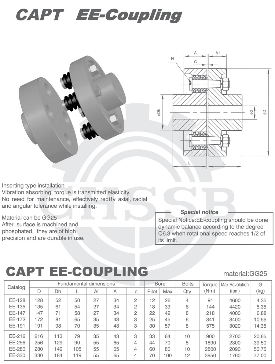 EE聯軸器插入式安裝;吸收震動,扭向彈性;免維護,有效糾正軸向、徑向、角向的安裝偏差;材質可選用