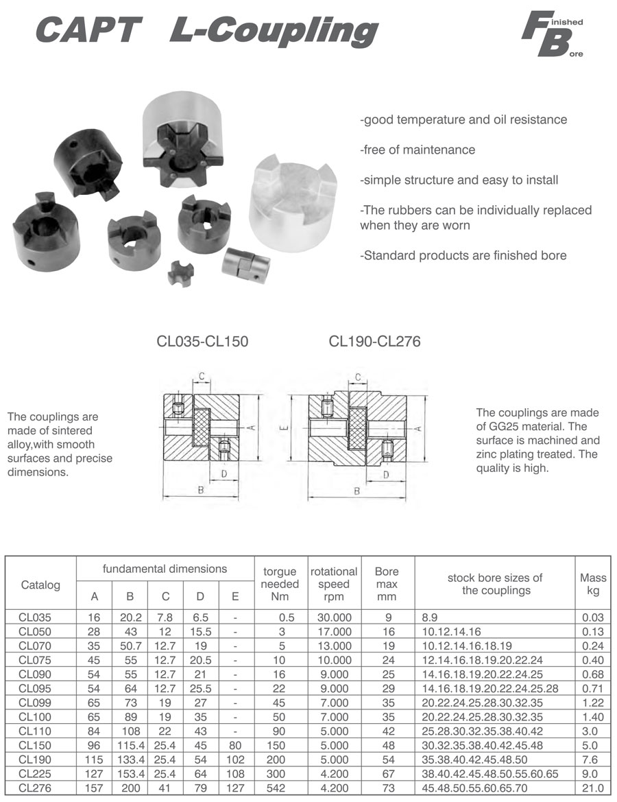 產(chǎn)品范圍: 美標(biāo):(FB-BL) 歐標(biāo):(CL) 英制尺寸產(chǎn)品(適用于美標(biāo)市場) 公制尺寸產(chǎn)品(適用于歐標(biāo)市場) FB型聯(lián)軸器 BL型聯(lián)軸器 CL型聯(lián)軸器